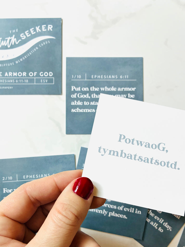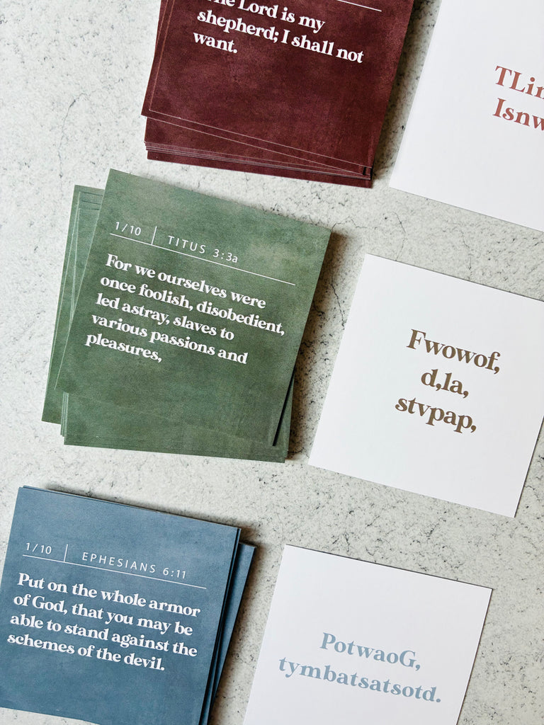 Memory prompts on the back—the first letter of each word printed gently for recall without giving away the whole verse