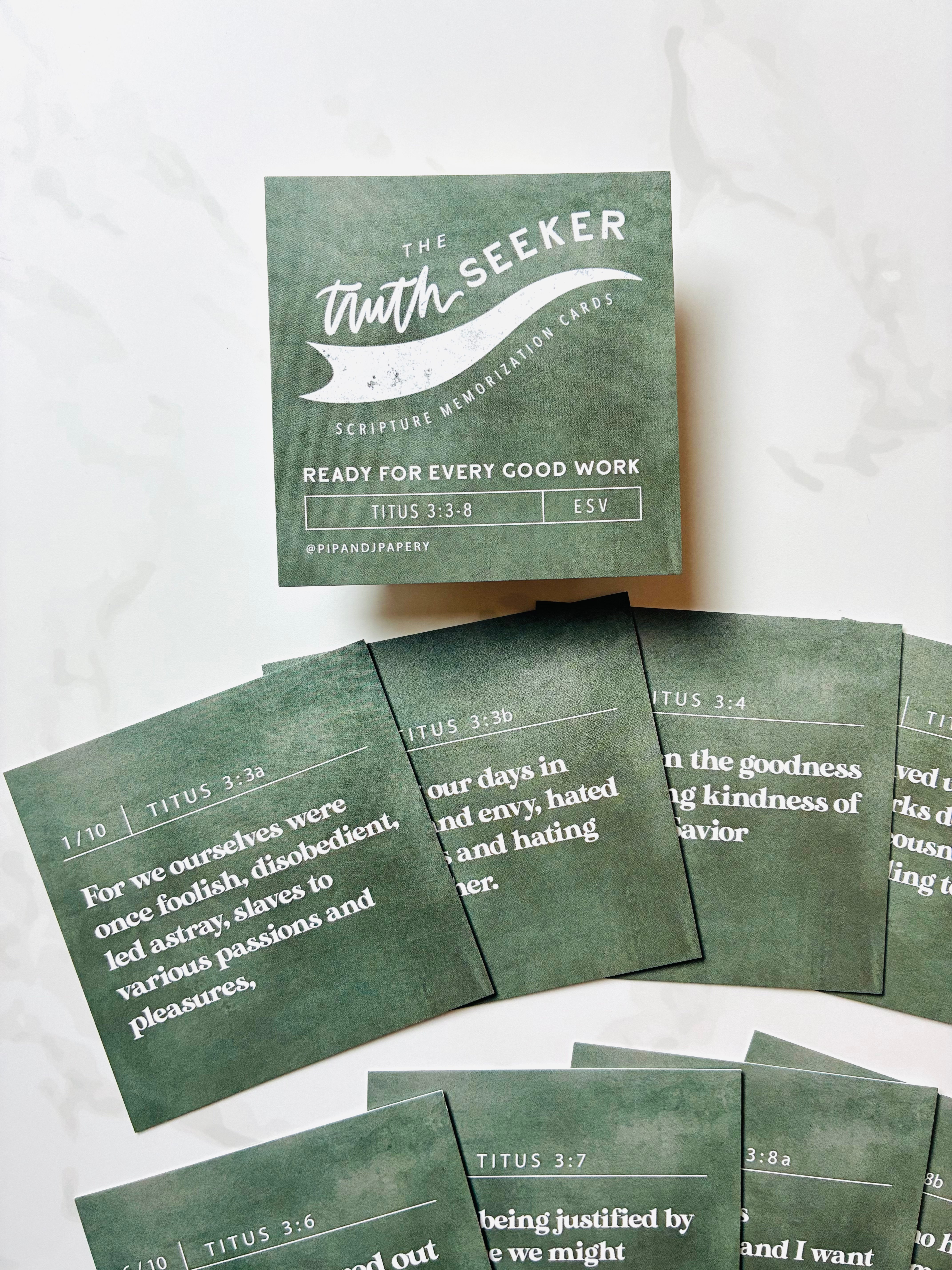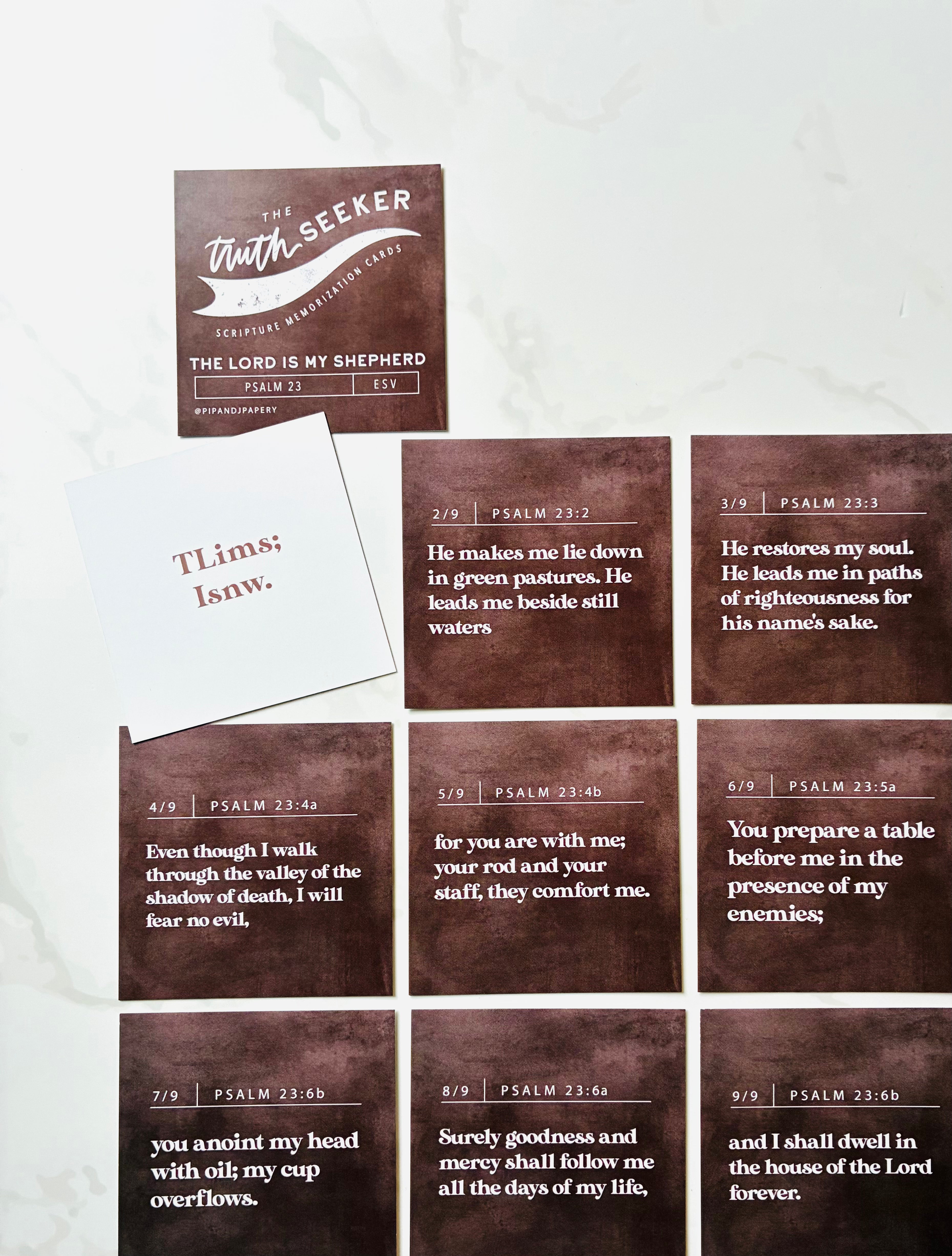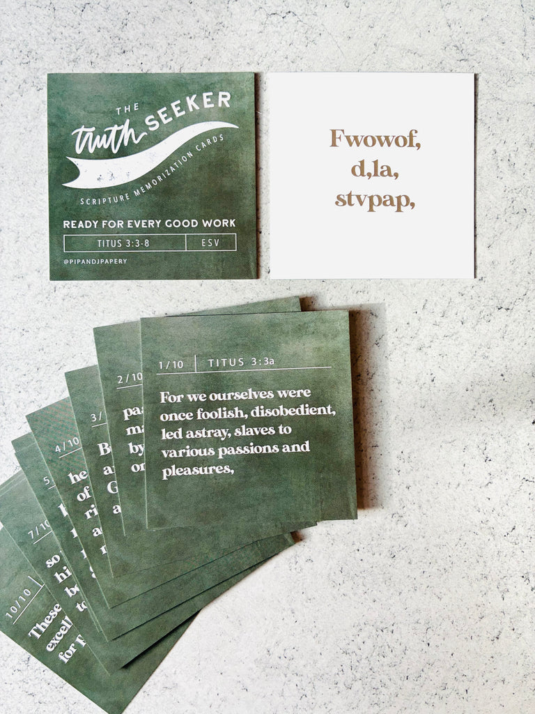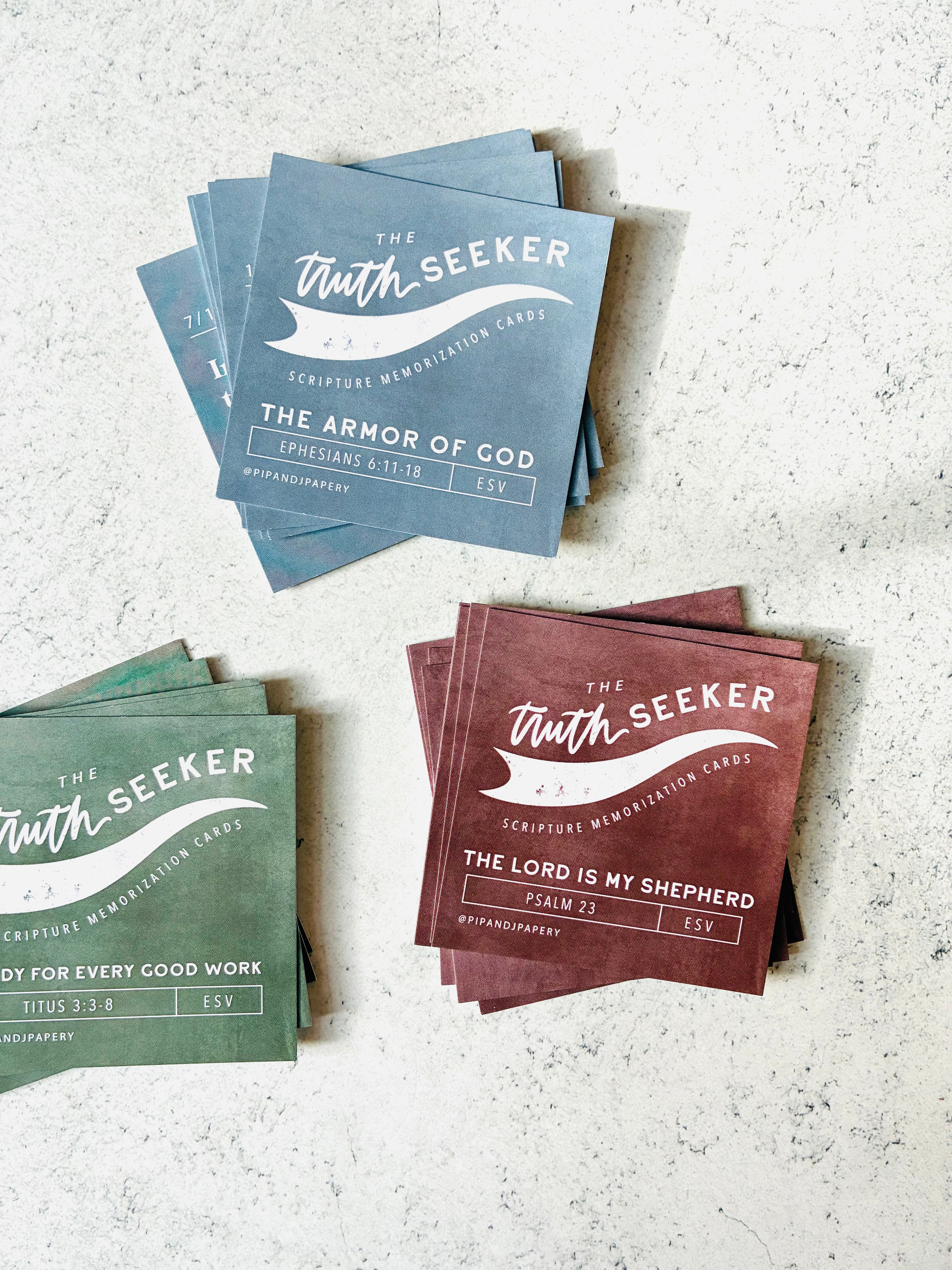Build confidence and joy in Scripture memorization with this beautifully coordinated Truth Seeker Scripture Memory Card Set, designed especially for kids learning longer passages. Each set features a rich, earthy color palette—deep blue for Ephesians 6, warm brown for Psalm 23, and soft green for Titus 3—creating a visually distinct and organized collection.